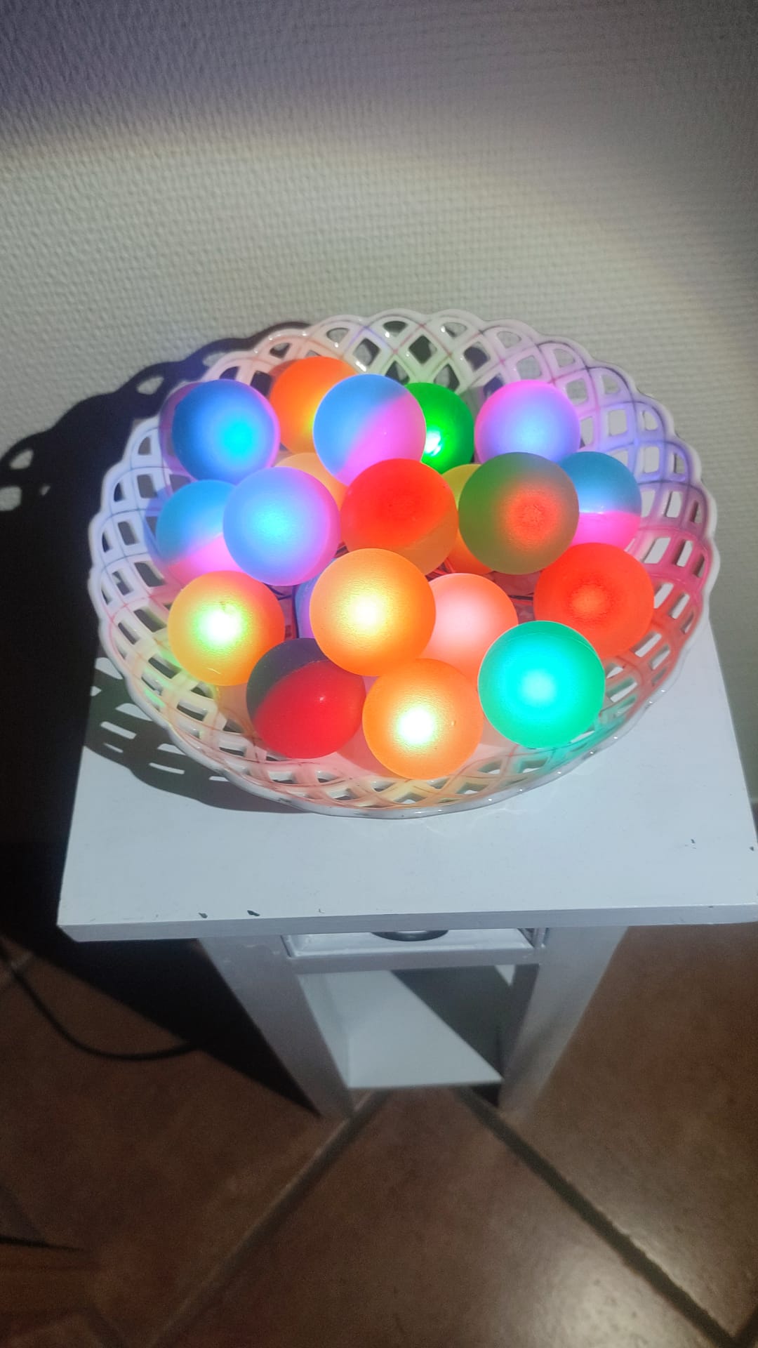 Hier ein neues Lichtobjekt von mir. IFLUMMINATI. Innenbeleuchtete Flummies, die langsam ihre Farbe wechseln und in einer alten Porzellan-Durchbruch Schale präsentiert werden.